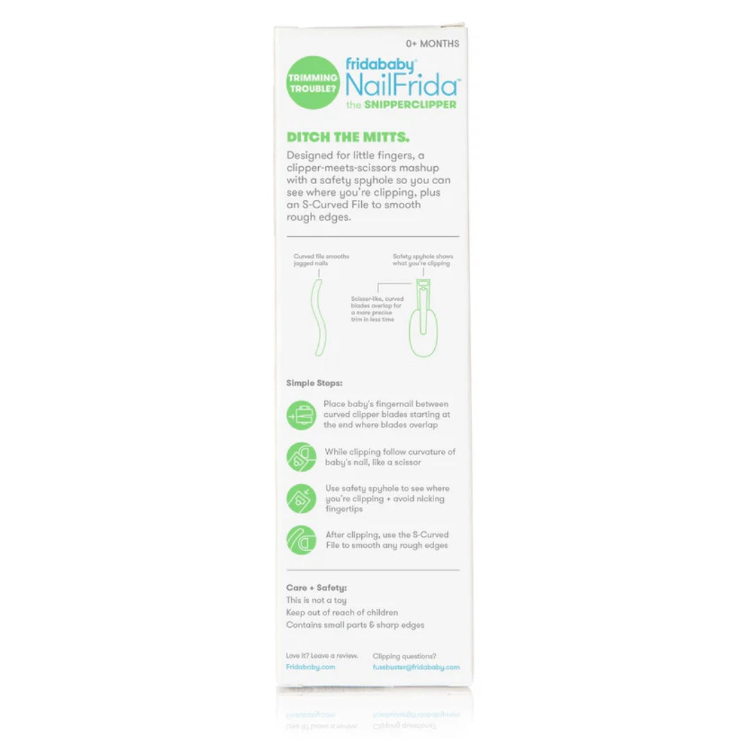 Tackle all of your trimming troubles without nicking baby's sensitive skin with the NailFrida SnipperClipper Set. See what you're snipping through the safety spyhole and nail that mani/ pedi every time. NailFrida's specially curved blades mimic the shape of a baby scissor and are uniquely designed for smooth and silent snipping. Smooth sharp corners with the curved S-file that's shaped just for baby- a must for newborn care.